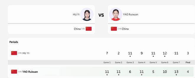 北京时间10月30日晚,2025年第三届亚青会全国乒乓球内战女单决赛,姚瑞轩以4比3战胜胡艺,夺得冠军。七轮比赛结果:11-7、11-2、6-11、11-9、5-11、10-12、13-11。这是一场激动人心的战斗。两位16岁天才展开较量。场面十分激动人心。两个人之间的决斗,并不逊色于一群成年人之间的决斗。姚瑞轩是世界排名第一的15岁以下球员。从去年开始参加乒超联赛。去年,她获得了U15世青赛女团、女单、混双三冠王。今年,国乒教练组直接让顶级16岁U19世青赛继续夺得女团冠军。 2025 年青少年乒乓球锦标赛女子 19 岁以下团体成员名单刚刚公布,冠军姚瑞轩也已出炉。鼠标。她真是一个“小恶魔”。值得一提的是,她是河北省队队员,国乒名将孙颖莎的妹妹。姚瑞轩与胡易的对决,堪称乒乓球界这一级别的巅峰之战。姚瑞轩一度2-0领先,但第三局胡怡并没有放弃,很快以11-6扳回一城。第四局,姚瑞轩以11-9获胜。也就是说,姚瑞轩已经3-1领先。从这里开始,姚瑞轩就显得有些轻松了,就好像绳子被直接割断了一样。胡艺从11-5追至2-3平。关键的第六局,双方从7-7打到10-10,但胡艺掌握了关键。也就是说,胡艺连平两局,再次以1-3落后,进入决战。在决战中,两位选手的交流和发球轮换非常精彩。两位年轻球员并没有意识到他们只有16岁。双方从4-4苦战到10-10、11-11。这一次,姚瑞轩没有错过重点。他凭借两个强大的董事会获胜。最终,姚瑞轩拒绝大复出,世界排名再次登顶。今年的亚青赛,姚瑞轩只晋级决赛,半决赛与林晚荣的比赛也是六局决出胜负。这七连胜再次证明了他世界级的能力。姚瑞轩 4-3 付毅 [11-7, 11-2, 6-11, 11-9, 5-11, 10-12, 13-11] 姚瑞轩 4-2 林万龙 [1 0-12, 11-7, 9-11, 12-10, 11-9, 11-8] 姚瑞轩 3-0 崔瑞妍[14-12, 11-7, 12-10] 姚瑞轩 3-0 庄子贤 [11-5, 11-2, 11-2].姚瑞轩 3-0 阿尔哈亚特 [11-2, 11-3, 11-2]。姚瑞轩 3-1 苏梓潼 [11-5, 11-5, 4-11, 11-5]。姚瑞轩 3-1 维吉特·维利亚古鲁 [11-3, 7-11, 11-9, 11-5]。